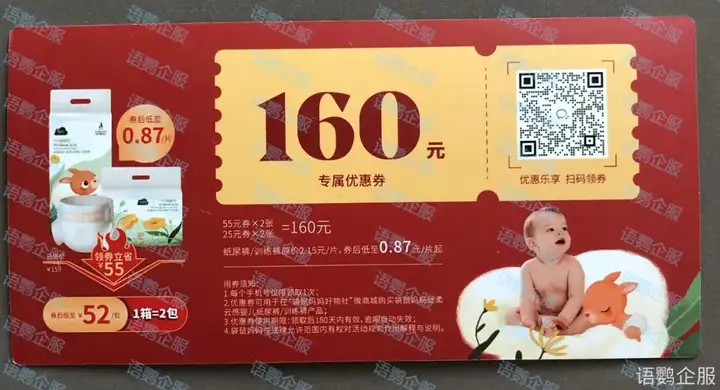 用户在袋鼠妈妈线上平台购买商品时,企业在商品的快递包裹中放置包裹卡,包裹卡实为优惠券卡片,用户收到商品包裹时即可获得包裹卡。包裹卡是纸质卡片,文字内容分成优惠券金额、语鹦企服员工活码、使用优惠券的规则限制三个部分。优惠券金额附有专属优惠券字样,优惠金额一目了然,这样的福利设计便于用户在看到卡片时,即刻获取优惠券的重要优惠信息。