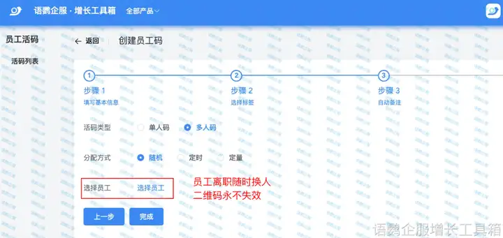 值得一提的是,当员工离职时,企业只需要在语鹦企服工具箱后台的员工设置中,将离职员工移除并添加新员工就可以了,提前印制好的包裹卡上的企微二维码还能继续使用,不造成资源浪费。