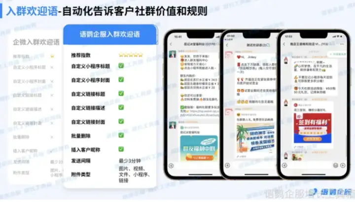冷启动阶段,最主要的是,是完成社群的一些基础配置。这一步关系到是否能建立社群权威,以及留住进群客户的概率有多大。其次,为了迎接下一阶段,也就是成长扩张阶段时期的流大批量涌入,企业需要提前做好对应的承接措施,如果流量较大,员工无法及时回复到新进群的用户,企业可以在语鹦企服增长工具箱的【入群欢迎语】设置相关入群欢迎语,这个入群欢迎语模块支持添加网页、小程序、图片等多种附件,且小程序可自定义设置封面及标题。