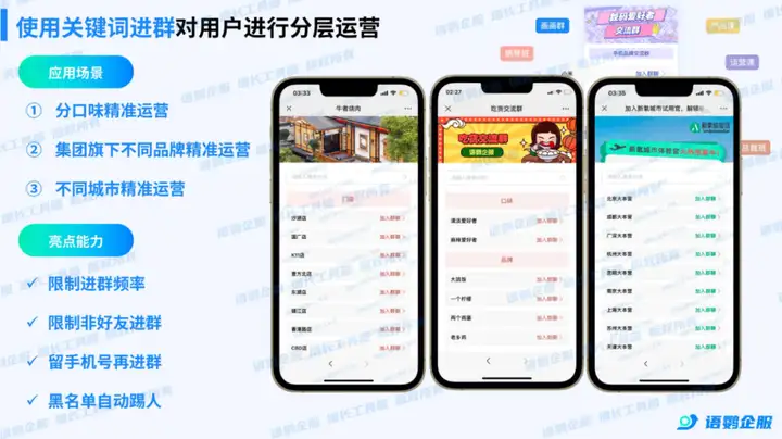 对于关键词进群的需求,以往是通过用户回复关键词,再自动拉客户进群。这个需求其本质是用户分流,形式不是最重要的,语鹦企服私域管家,开创性地采用了网页表单的方式对客户进行社群分流。用户不仅不需要输入文字,直接通过点击即可进入不同社群,还支持了频率限制,进群数量限制等,极大地避免了爆粉的人进群。