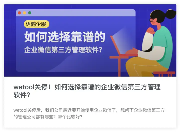 如果企业需要更多的功能扩展,可以选择使用合规的第三方工具。语鹦企服在官网博客中写过一篇关于《如何选择靠谱的企业微信第三方管理软件?》的文章,从接口文档目录、审查元素、是否单独安装额外工具、是否违反微信价值观四个方面,教你小白也能看得懂的识别合规第三方工具方法↓↓↓