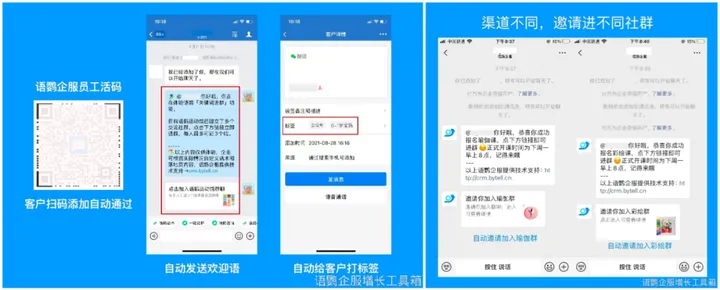 企业登录语鹦企服的后台,找到「引流获客」-「员工活码」创建一个员工码,按提示填写相关信息,在「附加欢迎语」一栏的附件中,选择附件类型为群聊,上传群二维码,并输入好邀请进群的标题和链接描述,当有客户扫描员工活码添加好友时,系统就会自动通过好友并向客户发送欢迎语和邀请入群的链接了。不同的活码也可以设置不同的进群链接,满足用户多样化需求。
