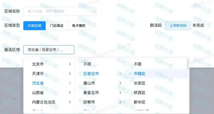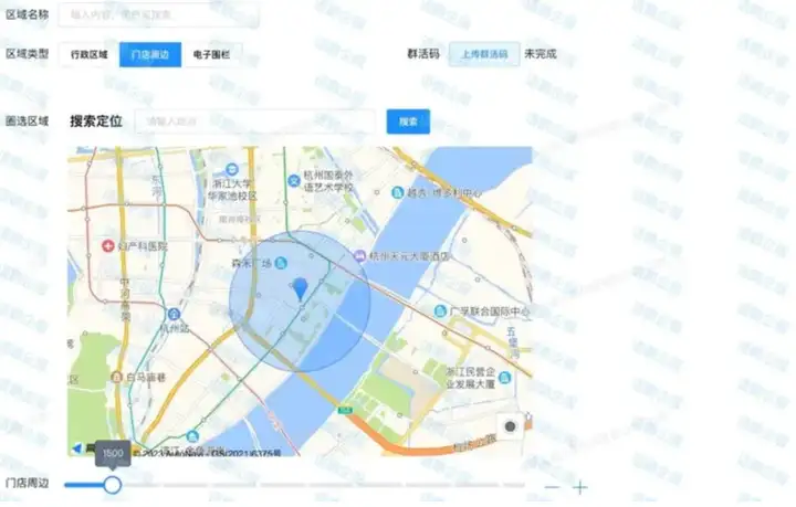 值得一提的是,【定位进群】功能支持多种形式的区域划分方式,比如可以城市或省份来划分区域、通过门店周边或区域半径来划分区域、通过电子围栏可以不规则划分区域等等,充分满足企业划分不同区域的客户的需求,来达到企业的精准管理和精确营销的目的。
