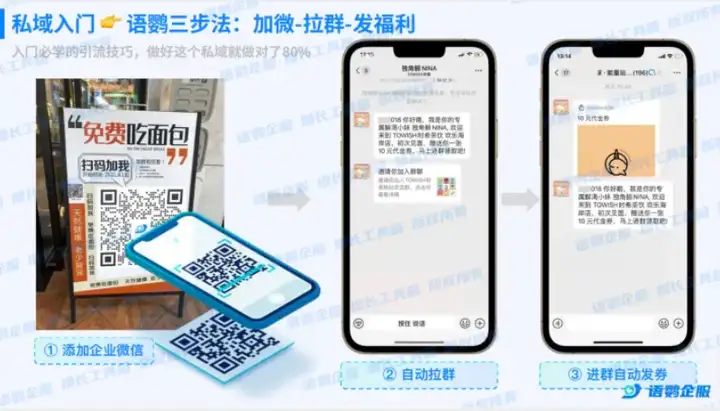 基于以上微信的私域布局,公域吸引的流量的最终指向:员工二维码或者群二维码,这整个流程离不开私域引流三步法:加企微一入企微群一福利官发福利。