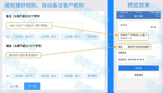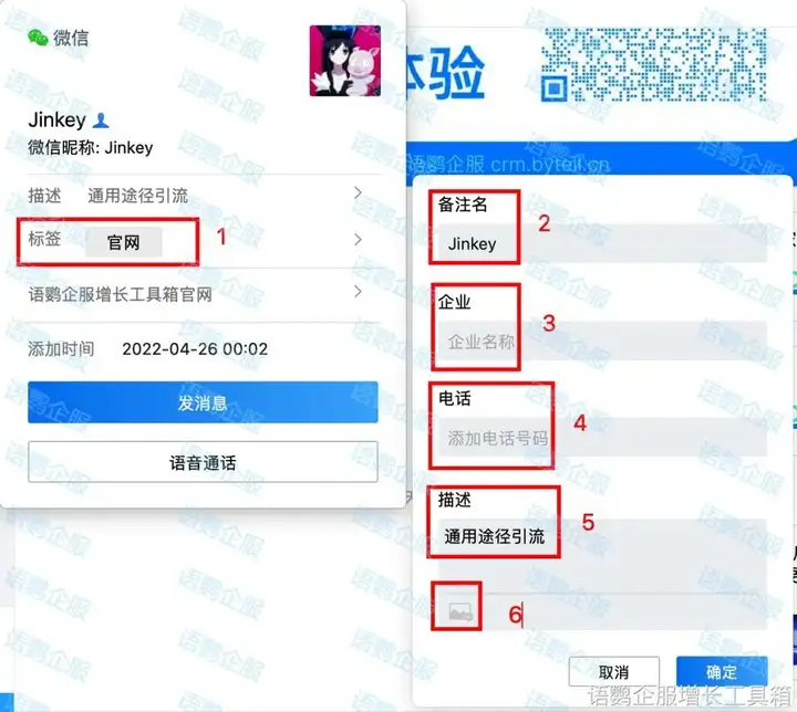 企业可通过语鹦企服的【员工活码】功能生成特定的企业微信二维码用于各渠道的投放。【员工活码】功能支持自动备注,当用户扫描员工活码添加企业微信后,语鹦企服系统会自动在用户名片上备注用户渠道来源及用户诉求,更方便企业进行用户渠道分析。