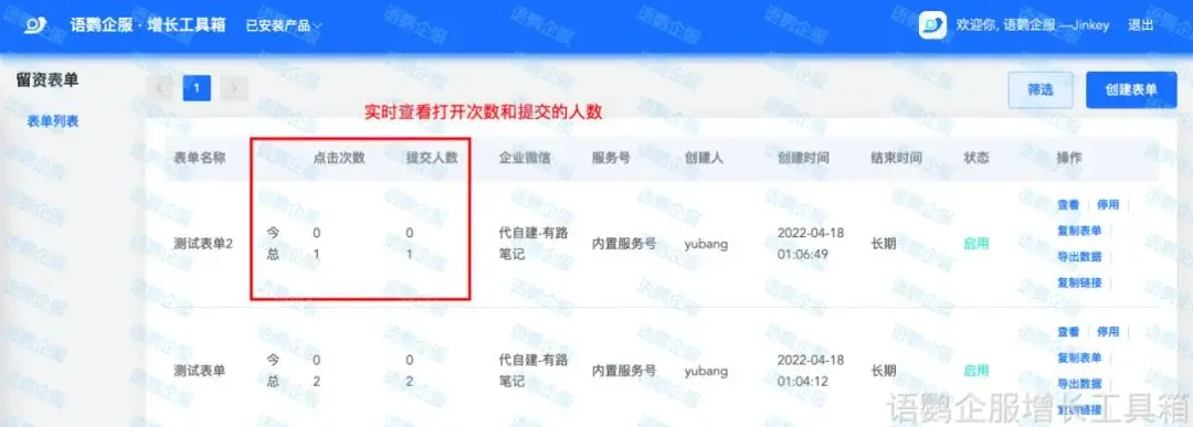 企业配置【留资表单】功能后,不仅可在语鹦企服后台实时查看打开表格问卷的人次及提交人次,还能够编辑、复制及导出用户填写的表单内容,更方便企业对客户进行数据统计、分析。