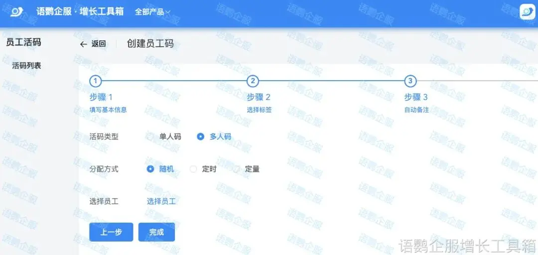 除此之外,【员工活码】功能还支持多种销售分配方式。企业可以通过【员工活码】功能设置单人码或多人码, 单人码只能添加一位销售,而多人码能够添加一个或多个销售员工。