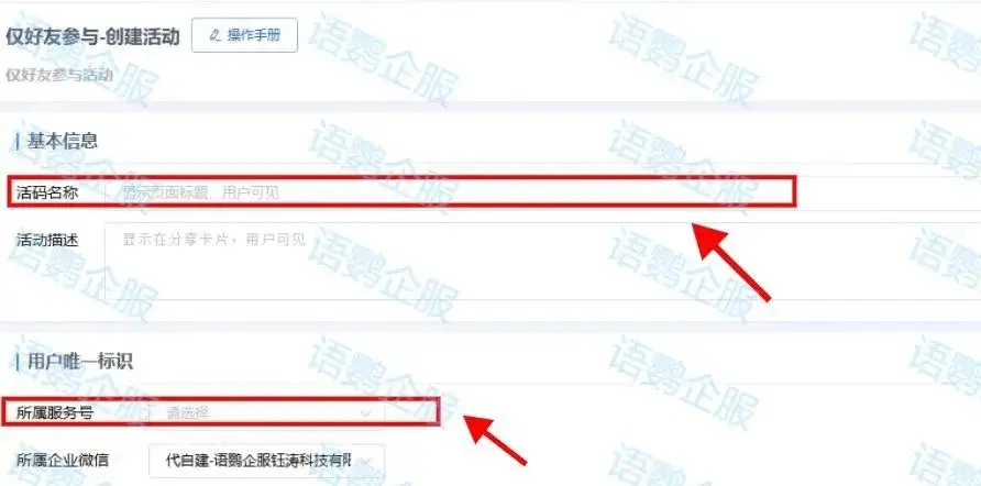 企业可以在语鹦企服工具箱后台的【仅好友参与】功能中设置识客码。首先,企业可以在仅好友参与功能中创建活动,而后填写活码名称、内容与封面,并填写用户唯一标识,将服务号与相应企业微信连接起来。