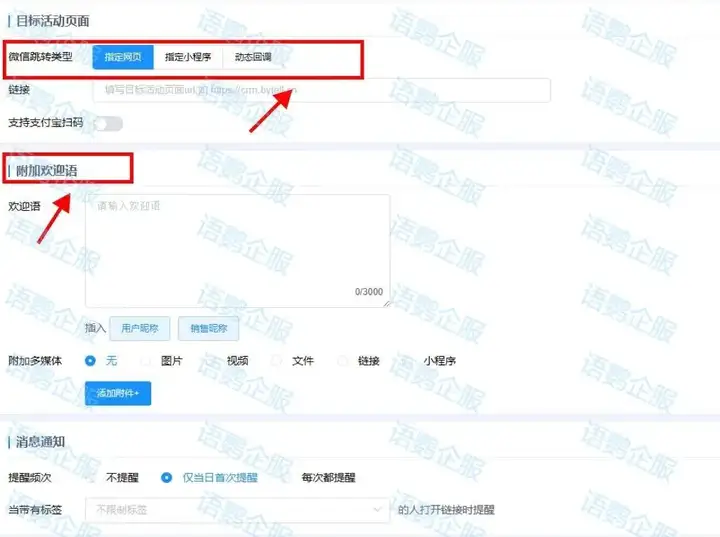 在目标活动页面中选择跳转的页面/小程序/动态回调,即可实现二维码跳转页面/小程序/动态回调。不仅如此,企业还可添加欢迎语,在新用户第一次添加企业微信时可自动向新用户发送欢迎语,让企业微信变得更加有温度,提升用户好感度。在设置完成后选择保存,即可获取相应获客码。