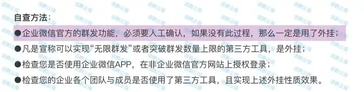 答案是否定的。首先,企业微信不能自动群发。《企业微信用户外挂自查指南》明确指出:企业微信官方的群发功能,必须要人工确认,如果没有此过程,那么一定是用了外挂。也就是说:凡是自动群发没有经过人工确认的软件,务必是外挂。不合规地使用第三方外挂工具会有信息泄漏、影响客户体验、违反法律法规、病毒和恶意软件攻击等风险,容易导致企业微信封号。