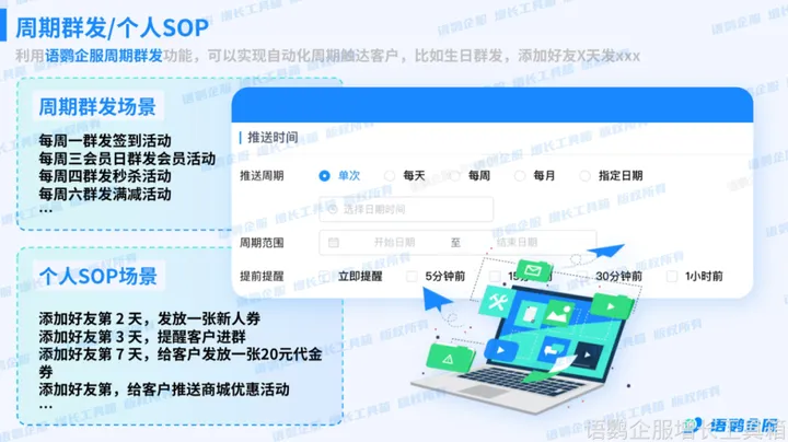 企业首先需要创建一个营销日历,对每日的营销活动进行详细的规划和整理。此时,企业可以利用语鹦企服的「周期群发」功能,这个功能允许企业设定定时发送营销消息的周期,如每天、每周或每月,并能指定在特定的周期内(例如从4月到7月)发送某一消息。这样可以确保营销信息的有序推送。
