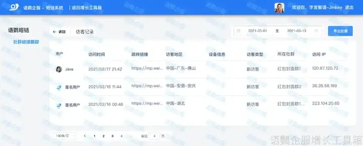 上面讲了「轨迹素材」的阅读提醒功能,下面就来说说「社群链接跟踪」。「社群链接跟踪」功能不仅提供了详细的数据报表,让企业能深入了解链接的访问情况,如访客记录、访问时间、访问地区、访问设备、访问来源等,有助于企业分析用户的阅读习惯和兴趣偏好,为后续营销策略提供数据支持,而且还支持查看同一链接在不同社群中的访问量,能帮助企业了解不同社群的活跃度和用户偏好,实现更精确的运营。通过对比不同社群的数据,企业还可调整在不同社群中的推广策略,以提高营销效果。