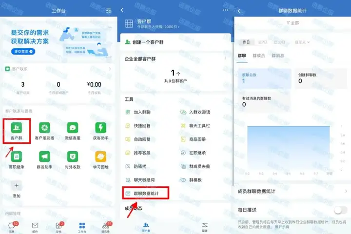 企业微信中有群聊数据统计功能。在企业微信的工作台中选择客户群,而后选择群聊数据统计即可统计该企业微信的群聊数据。通过该功能,企业还可了解该企业微信下的群聊总数、群成员数等,大致了解客户群的运营情况。