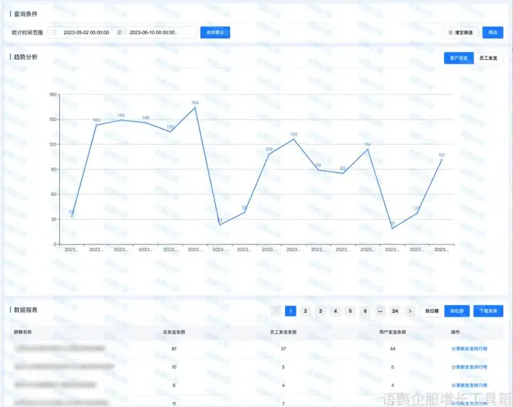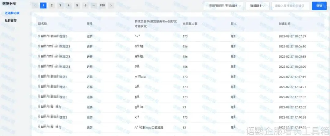 如果企业想要更加深入分析社群运营效果,可以通过语鹦企服的进退群记录功能得到各个社群详细的进退群记录,了解社群人数走势,对比不同社群的运营效果,更易实现精准营销转化。