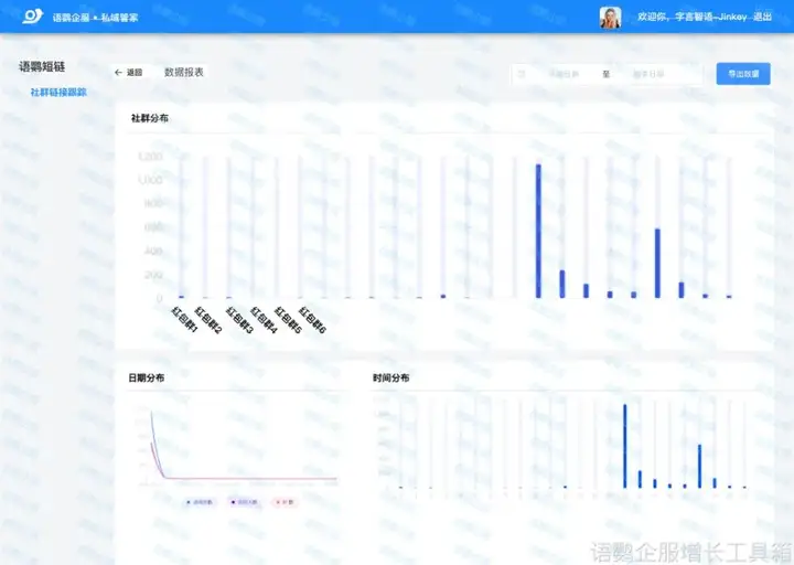 企业通过语鹦企服的社群链接跟踪功能不仅可统计链接被各个社群用户访问的次数,还可清晰了解链接被访问的日期、时间,得到相应的数据分布,帮助企业掌握不同社群用户的活跃时间,更方便后续针对性的展开营销活动,提高转化率。