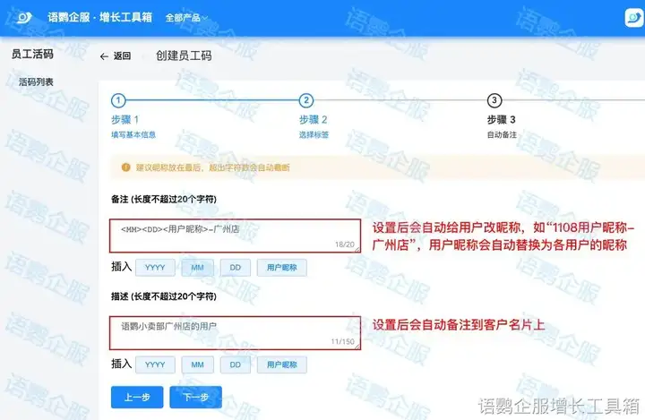 【员工活码】功能还支持自动备注。当用户添加员工企业微信后,系统会自动按规则给用户进行备注,方便员工更直观的了解客户渠道来源及诉求。