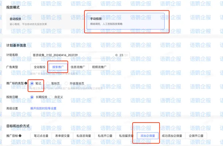 4. 开始广告投放:目前,小红书发现页不会出现企微链路笔记,只有用户在搜索页搜索相关关键词时,才有可能触发企微链路笔记。因此,商家只能通过聚光广告定向搜索计划才可以实现企微调整链路。