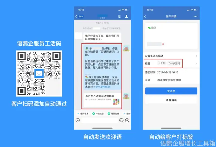 这是建立私域流量池的关键。需要确定客户添加企业微信的渠道,以及根据客户添加来源,自动给客户打上相应的标签,方便后续的精准服务和营销,比如群发特定的内容、拉入对应的企业微信群等。企业可以借助语鹦企服的“员工活码”功能,快速创建员工活码,并设置自动欢迎语和标签,实现客户添加流程的自动化。