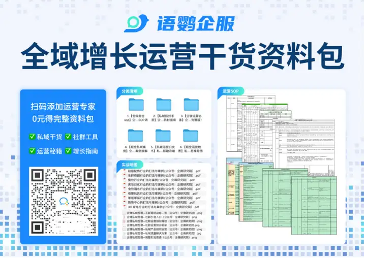 总而言之,企业微信社群运营,不仅需要内容和活动,更需要制定完善的SOP,才能确保运营效率和效果。那么企业微信社群运营有SOP模板吗?语鹦企服整理了一个超赞的《全域增长运营干货资料包》,里面就包含了经典的瑞幸咖啡企业微信社群运营的SOP表、导购私域运营完整实操SOP等,有需要的小伙伴欢迎领取。