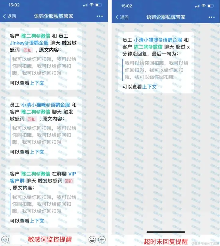 企业可利用语鹦企服的 “会话内容存档”功能 存档员工与客户的聊天记录,方便企业进行服务质量监控,解决客户纠纷,进行团队管理。会话存档支持设置敏感词监控,防止员工在与客户沟通中使用不规范的语言,维护企业形象。对于超时未回复的消息,系统还会提醒员工及时回复客户信息,提高客户满意度。