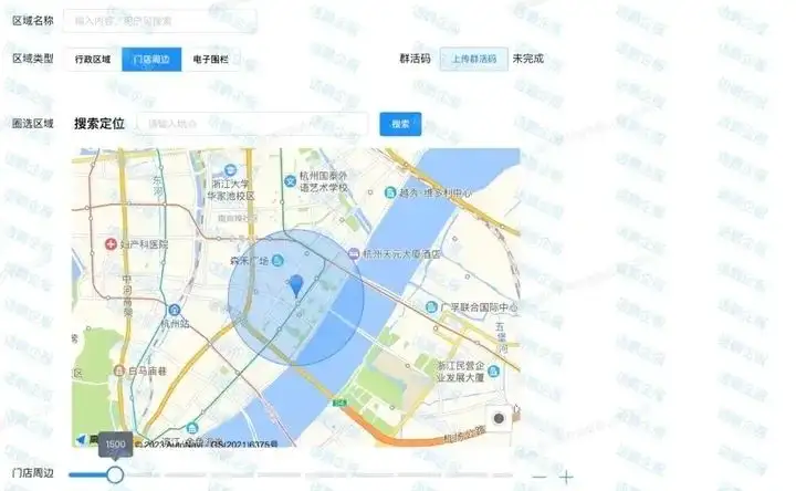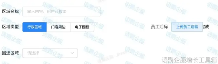 语鹦企服的「定位进群」功能支持按行政区域、门店周边(按坐标点半径)和电子围栏(按不规则多边形)三种区域类型选择。