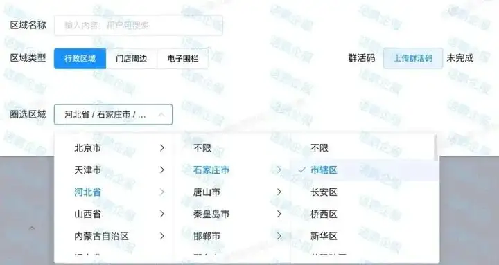 设置好落地页后,只需要输入区域名称,选择好区域类型和区域,最后上传员工活码就可以了。语鹦企服支持按行政区域、门店周边和电子围栏三种类型进行划分,可以满足不同企业规模的运营需求。实现定位到门店->添加店长->邀请进入门店群的链路。