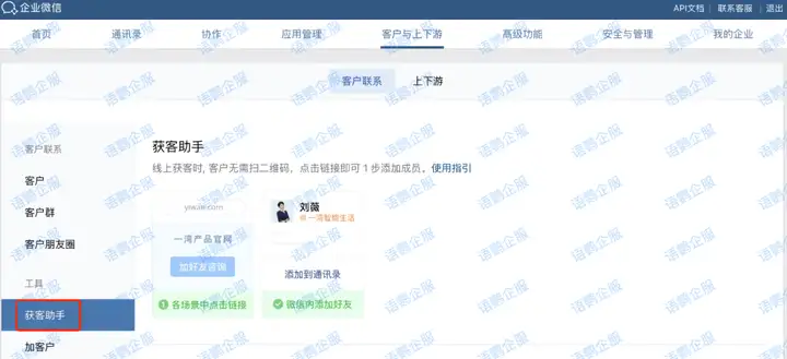 2)开通企业微信获客助手:紧接着,确保你的企业已经注册并设置了企业微信,并开通了获客助手功能。这可以通过企业微信的web管理后台进行设置。获客助手功能用于链接小红书直跳功能,实现用户与品牌的无缝对接。在这一过程中,如果你需要专业的指导和帮助,可以联系【语鹦企服】,我们将为你提供从资格确认到功能开通的一站式服务。