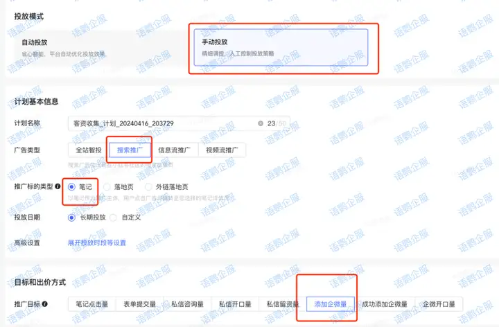 想要实现”添加顾问”效果,需要企业拥有:①直跳企业微信功能内测资格、②企业微信并开通获客助手功能,③小红书聚光广告平台接入企业微信获客助手,④投放广告创建定向搜索计划。