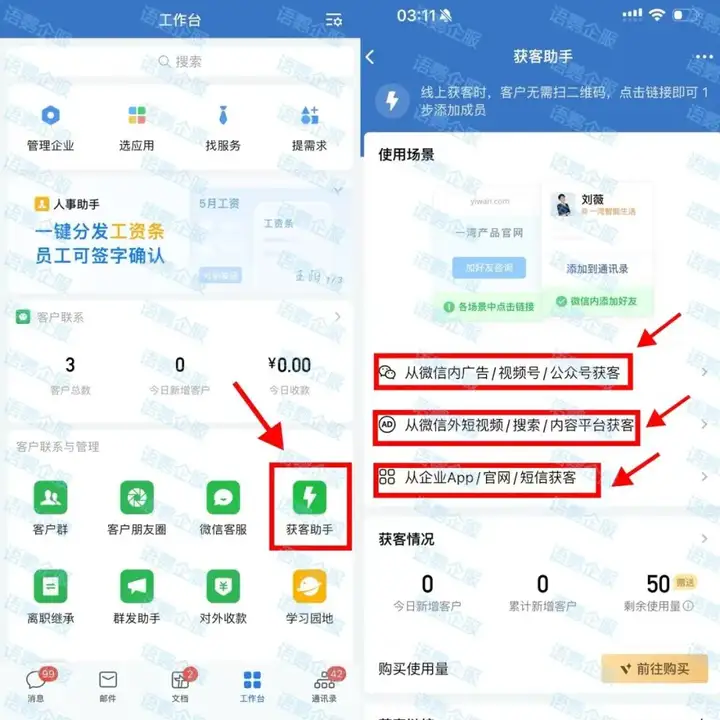 【获客助手】功能虽然能够显著提升获客效率,但仅限前50次免费使用,50次后每引流添加一名用户均需向企业额外收取1元。对于获客量较大的装修企业而言,这也是一笔不小的费用,所以装修企业可以通过语鹦企服的【加粉链接】功能进行获客,在支付固定年费后即可使用,不进行额外收费,更适合获客量大的装修企业。