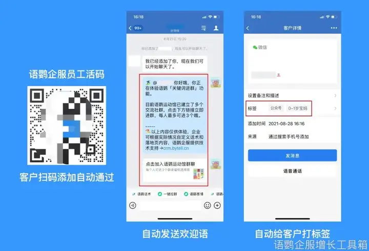 当用户扫描员工活码添加企业微信后,系统会自动通过好友请求并自动识别用户渠道来源,为其打上相应的渠道标签,推送相应渠道欢迎语/群聊,减少企业员工私域运营中的大量繁杂操作,提升私域运营效率,实现私域运营精细化。