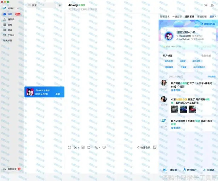 装修行业客户生命周期长,企业需要对不同阶段的客户进行精细化运营,提高转化和复购率。例如,针对潜在客户:企业利用语鹦企服的【客情侧边栏】功能,深度分析客户的装修风格偏好、预算范围、户型需求等,为精准营销提供数据支撑,并针对不同需求的用户推送个性化内容,例如新房装修指南、老房翻新案例等,并结合优惠活动,促进客户转化。