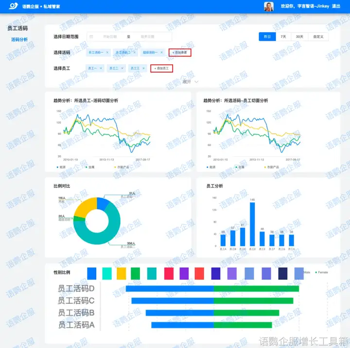 然而,企业微信后台仅提供整体数据,无法区分不同渠道的外部联系人增长情况。想要更精细化地查看每个渠道的引流效果,可以使用语鹦企服的员工活码功能。您可以为每个推广渠道生成不同的员工活码,并放置在对应的渠道物料中。当客户通过扫描活码添加员工为好友时,系统会自动记录客户来源渠道,并生成详细的数据报表,方便您分析每个渠道的引流效果,以及不同员工的客户转化率等关键指标。
