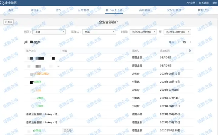 在企业微信管理后台客户与上下游,“客户联系”页面,您可以查看企业所有外部联系人的列表,包括昵称、头像、添加时间、来源、添加人等信息。