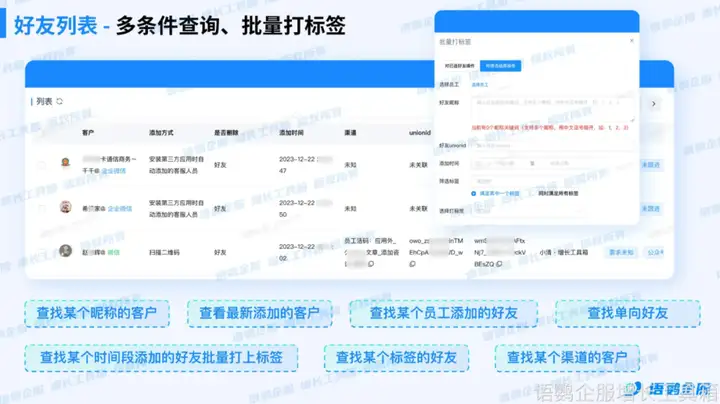除此之外,通过语鹦企服“好友列表”功能,企业还可以给特定时间段添加的好友批量打上标签。比如针对近期添加活动的好友批量打标签,基于这些丰富的信息,您可以更有针对性地进行内容推送、活动策划、客户关系维护等,实现千人千面的精准营销,将客户转化为忠实粉丝!