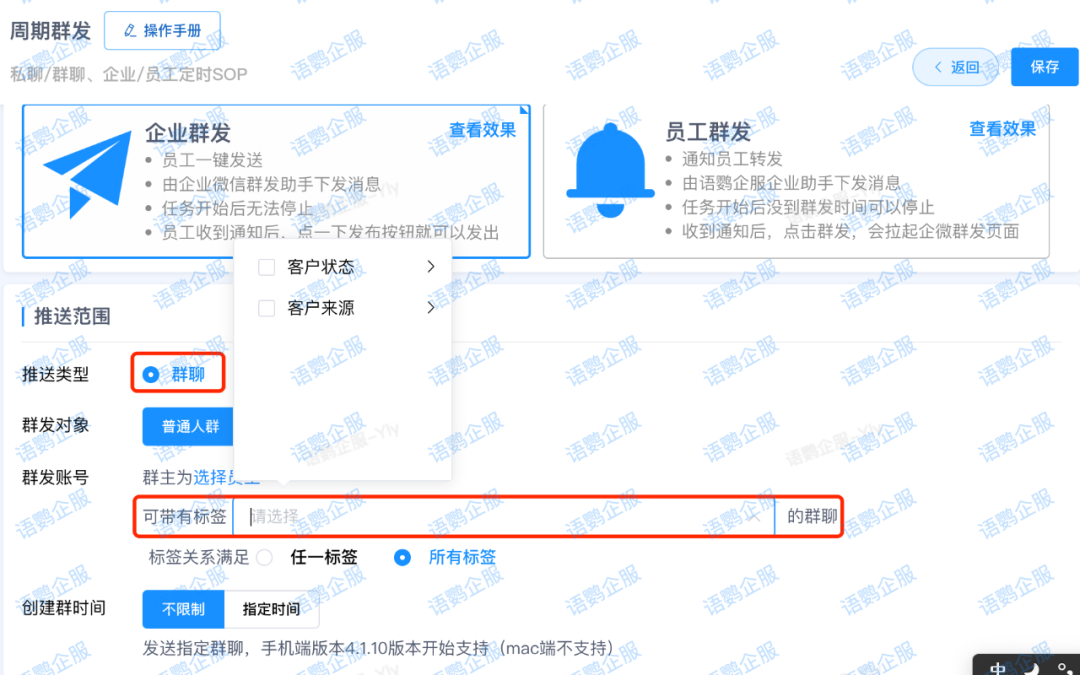 企业可以根据客户特征和业务需求,为客户群设置不同的标签,例如“VIP客户”、“意向客户”等,并通过语鹦企服工具箱即可实现按标签筛选客户群进行精准群发,提高营销的针对性和有效性。
