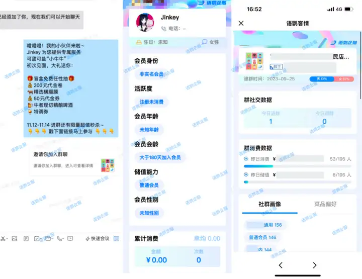 语鹦企服的定制化【客情侧边栏】功能可以很好地体现这个优势。它能够将企业微信、公众号、小程序等平台的用户数据进行整合,在企业微信的聊天界面中展示客户的完整信息,包括其在其他平台的标签、行为数据、会员等级、消费记录、生日等。这样,企业就可以更全面地了解客户,制定更精准的营销策略。