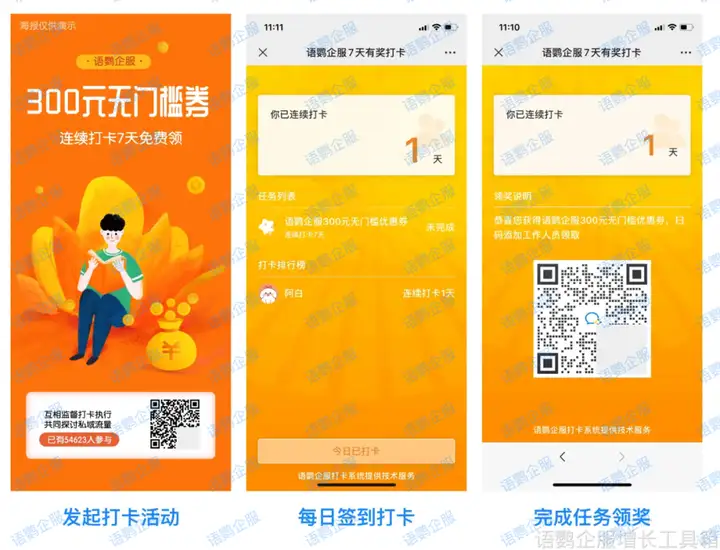 将打卡二维码/链接发送给私域用户后,用户可通过打卡海报进行打卡,到达指定打卡天数后,系统会引导用户添加相应工作人员微信进行领奖。