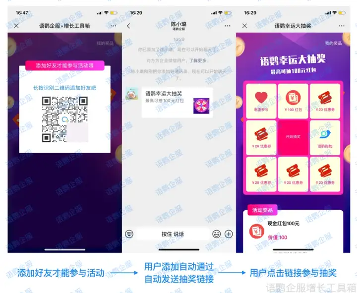 食品饮料企业可通过语鹦企服的【抽奖助手】功能设置大转盘/九宫格抽奖。为了将福利切实给到私域用户,企业可以设置私域专属机制。私域用户扫描抽奖二维码后,系统会直接跳转到抽奖界面,而非私域用户扫码抽奖时,系统会引导其添加企业微信,添加成功后才会自动发送抽奖链接邀请用户参与抽奖。