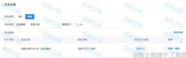 食品饮料企业可通过语鹦企服的【群签到打卡】功能创建签到打卡任务,设置好活动类型、发奖账号、活动等级等信息后即可生成打卡二维码及打卡链接,更方便食品饮料企业进行打卡二维码分发,提升食品饮料企业私域运营效率。