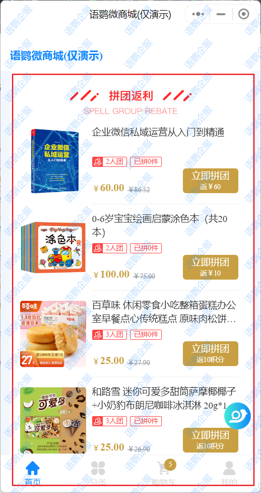 【语鹦微商城】还支持设置拼团返利。开启品团返利后,拼团成功后即便实际未成团,系统也会自动退款,同时拼团用户可获得对应的奖励。