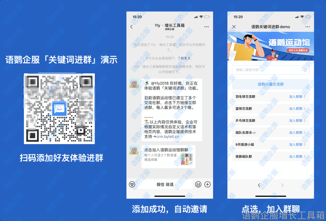 物业企业可以通过语鹦企服的【关键词进群】功能精准、快速邀请小区用户添加企业社群。【关键词进群】功能支持加好友自动邀请进群,小区用户添加物业企业微信后,系统会自动向小区用户推送小区社群,无需打字搜索也可快速入群,更适合全年龄段业主。