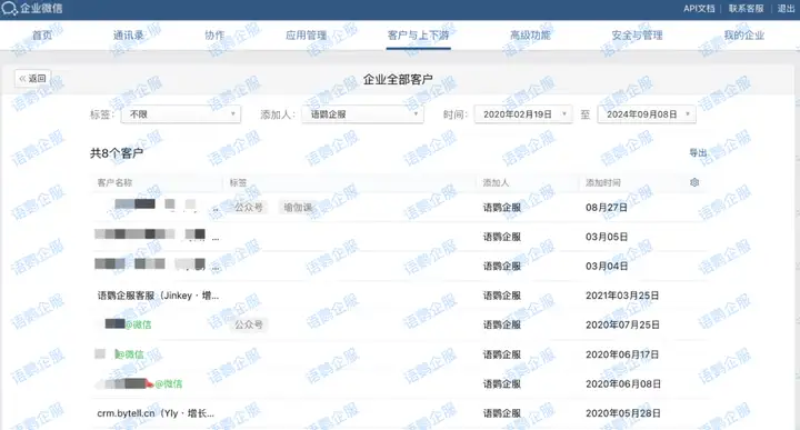 以上就是关于《企业微信怎么看指定员工的所有客户?企业微信怎么判断客户归属?》的相关内容了。企业微信虽然提供了基本的客户管理功能,但对于一些复杂的需求,例如客户归属判定、客户标签管理、客户分析等,仍然需要借助语鹦企服私域管家来实现。语鹦企服可以帮助企业更便捷、高效地管理客户资源,提升客户服务效率,实现企业微信私域流量运营的精细化管理。更多企业微信私域玩法,欢迎关注语鹦企服私域管家。