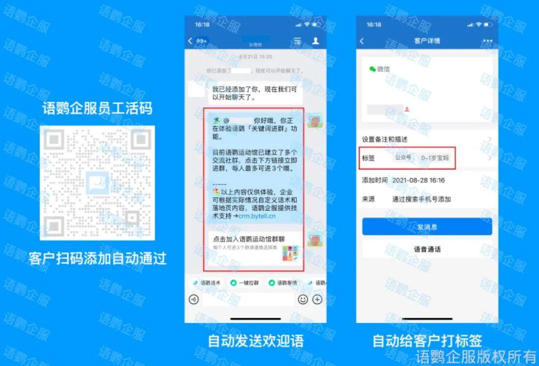 同时,语鹦企服员工活码系统,会自动给客户发送打招呼欢迎语,并打上预设好的标签,如来源于公众号渠道,则打上「公众号」标签。