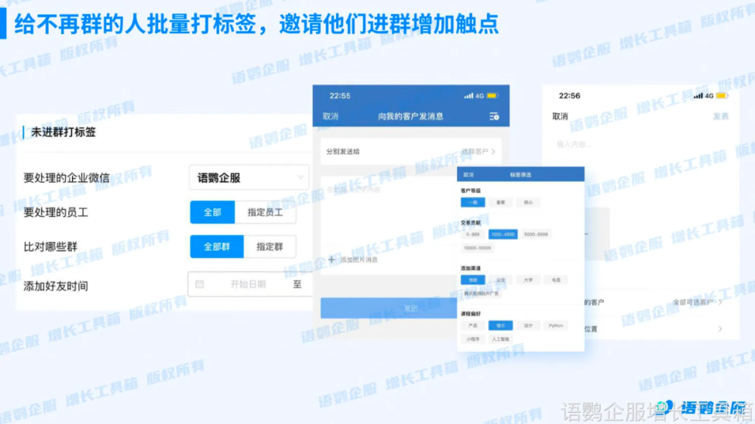 语鹦企服的 “在群/不在群打标签” 功能: 语鹦企服提供了一个方便的工具,可以帮助企业快速识别哪些客户不在群里。