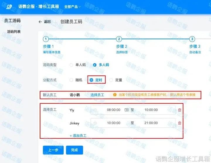 3)优化添加好友方式:企业可以利用语鹦企服的“员工活码”功能,创建多人码,客户扫描后可随机添加任一企业微信好友。一旦其中一个企业微信账号异常,可以随时在后台移除异常账号并更换新的员工号接待客户。