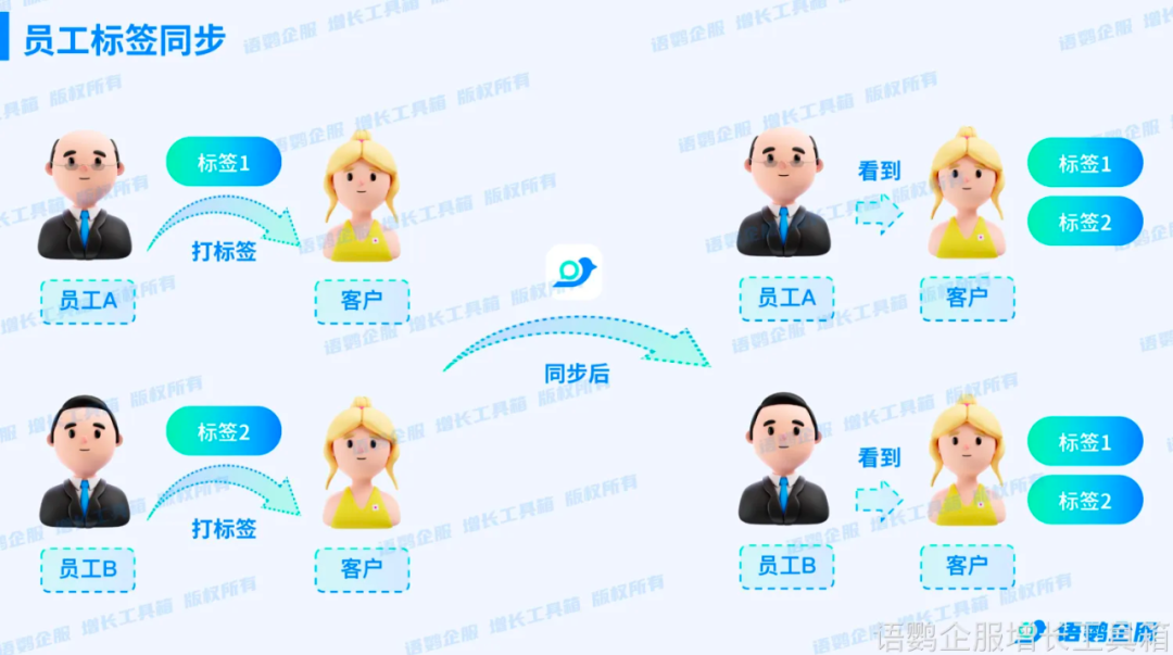 语鹦企服的「员工标签同步」功能可以完美解决企业微信本身没有提供客户标签同步的功能这一难题。具体来说,当企业开启该功能后,如果同一个客户添加了多位员工的企业微信,那么其中一位员工给该客户打上的标签,会自动同步到其他员工的企业微信客户列表中。
