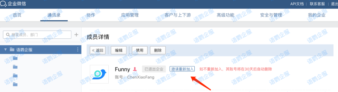 如果你是因为误操作,不小心“离职”了,那么你的账号数据都还保留在企业微信中,只需要立即联系企业微信管理员,由管理员登录企业微信后台,在通讯录找到已退出企业的账号,点击【邀请重新加入】即可。