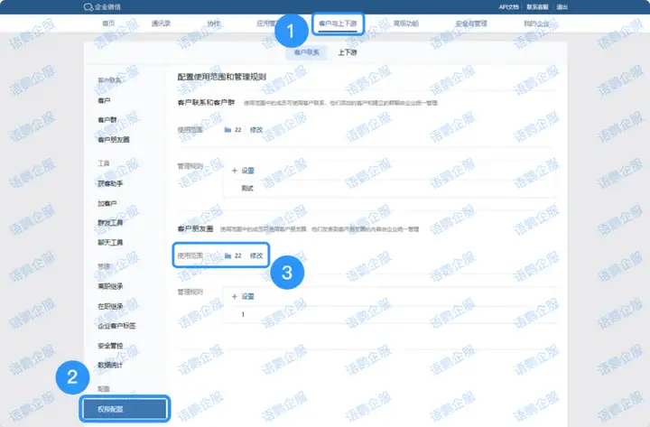 企业管理员可以在企业微信【管理后台->客户与上下游->客户联系->权限配置】入口,设置朋友圈使用范围,通过设置员工的权限,限制员工查看客户朋友圈的权限。例如,可以设置只有管理员或者特定部门的员工才能查看客户朋友圈。这样一来,部分员工就无法查看客户朋友圈入口啦!