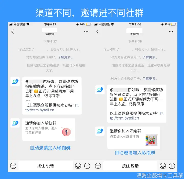 除此之外,【员工活码】还支持同一员工不同渠道的员工活码设置特定的欢迎语、入群邀请。企业可以在不同渠道投放同一员工的不同员工活码,例如:在抖音投放参加瑜伽课的员工活码,在微信投放彩绘课的员工活码。当抖音用户扫描员工活码后,系统会自动推送瑜伽课的欢迎语及群聊链接,而微信用户扫描员工活码后,则会自动推送彩绘课的欢迎语及群聊链接。