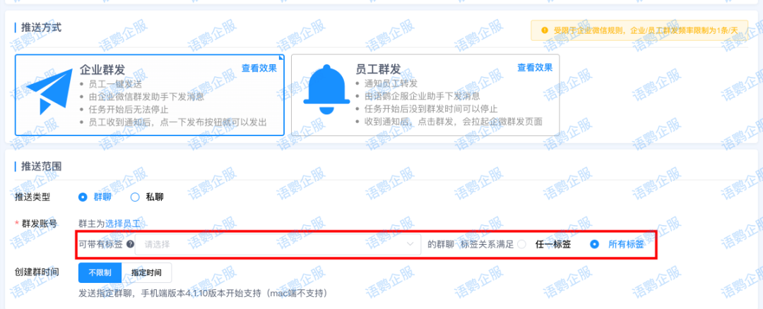 例如,企业想要向“爱好旅游”且“消费能力高”的客户群体推广高端旅行套餐,就可以利用【好友列表】功能,筛选出同时拥有这两个标签的客户,并通过语鹦企服定时【标签群发】功能进行精准营销。